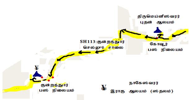 வழி : புதன் ஆலயத்தில் இருந்து மீண்டும் மெயின் ரோட்டிற்கு வந்து (SH 113) அதே சாலையில் வலப்புறம் திரும்பி குன்றத்தூரை நோக்கிச் செல்ல வேண்டும். அதில் சென்றால் இடதுபுறம் சேக்கிழார் ஸ்கூல் மற்றும் தேவி மூகாம்பிகை ஆலயம் போன்றவை வரும். அடுத்து குன்றத்தூர் மெயின் பஸ் நிலையம் வரும். அங்கு சென்று பக்கத்து தெருவில் திரும்ப திரு நாகேஸ்வரர் எனும் இராகு ஸ்தலத்தைக் காணலாம். யாரைக் கேட்டாலும் கூறுவார்கள்.