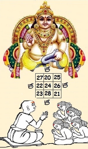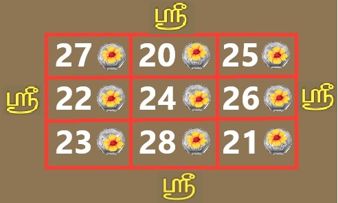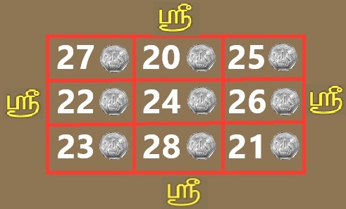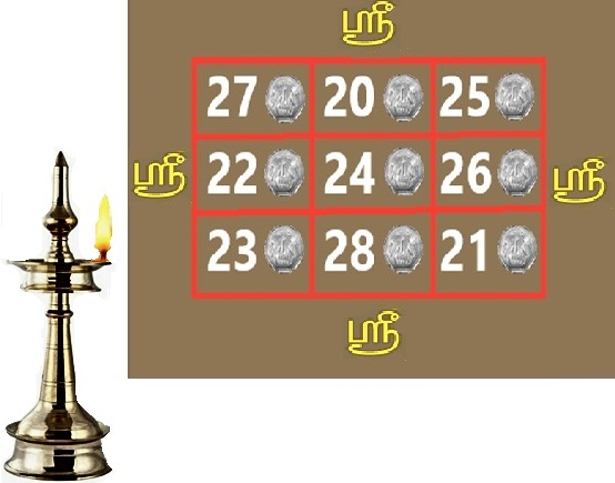 3. மேலே காணும் யந்திரக் கோலத்தைப் அரிசி மாவு, குங்குமம் மற்றும் மஞ்சள் பொடியைக் கொண்டு போட வேண்டும். கட்டங்கள் குங்குமத்திலும், எண்கள் அரிசி மாவினால் மற்றும் ஸ்ரீ எனும் எழுத்து மஞ்சள் பொடி அல்லது சந்தன பொடி அல்லது தண்ணீரில் குழைத்த சந்தனத்தினால் போட வேண்டும். அதன் பின் ஒவ்வொரு கட்டத்தின் எண்களின் பக்கத்திலும் ஒவ்வொரு நாணயத்தை வைக்க வேண்டும். அதற்கேற்ப யந்திரத்தின் கோலத்தைப் போட வேண்டும்.