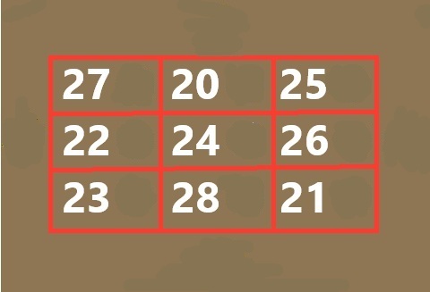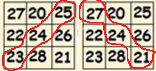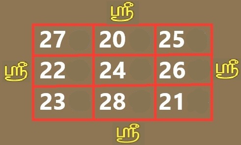 யந்திரத்தில் உள்ள அனைத்து எண்களை பெருகினாலும் அதே எண்ணிக்கையாக இருக்கும்.27 x 20 x 25 x 22 x 24 x 26 x 23 x 28 x 21= 780832483200 = 45 = 9